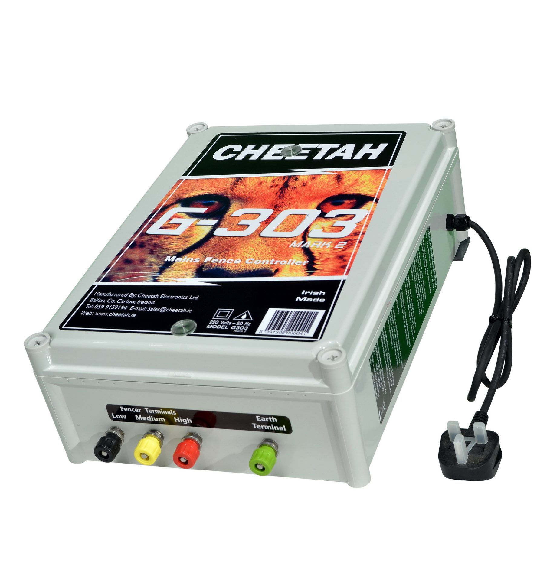 The Cheetah G303 Mains Fence Energiser is a powerful, top-of-the-range electric fence unit designed for large farms and demanding fencing systems. Built for strong and reliable performance, it is capable of powering large boundaries and handling heavy vegetation loads while maintaining strong fence voltage.